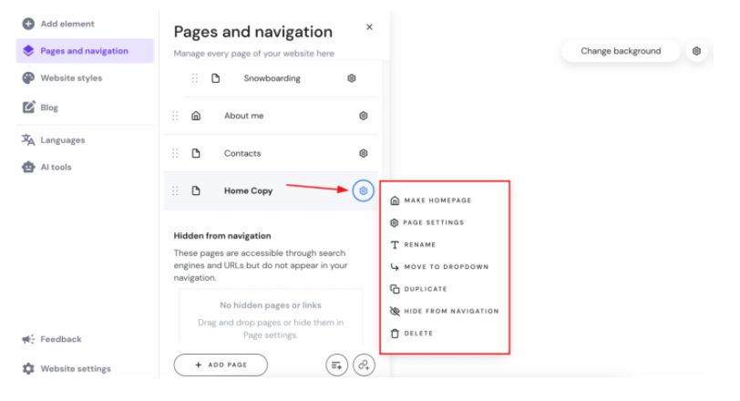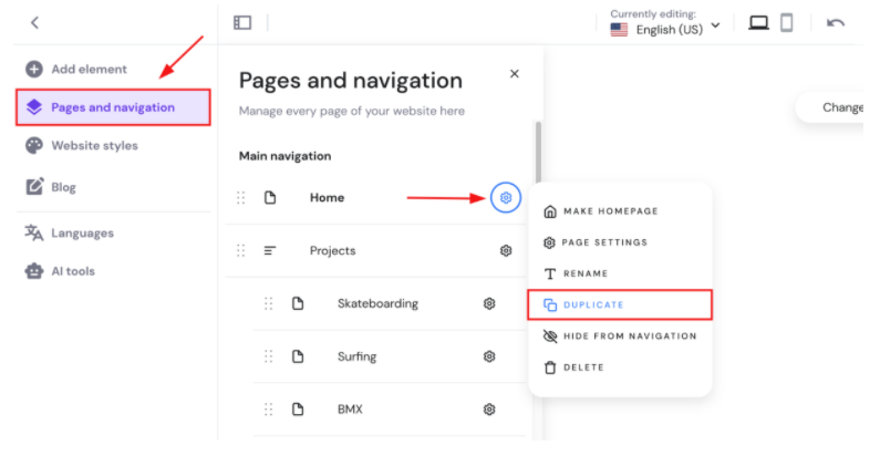 在网站编辑器中,打开左侧的页面和导航菜单。找到有问题的页面,打开其设置,然后选择Duplicate: