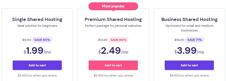 Hostinger虚拟主机有单网站主机(Single Shared Hosting)、高级版虚拟主机(Premium Shared Hosting)、商业版虚拟主机(Business Shared Hosting)三种套餐可选,下单时记得先核验前文优惠码哦,将有机会再优惠10%。