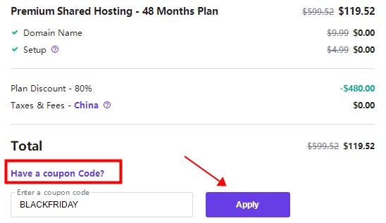 选择合适的方案,Hostinger虚拟主机月付套餐通常没有优惠,所以建议按年支付,可以享有较大折扣。在这里Hostinger高级版虚拟主机四年期账单原本可优惠80%,点击Have a coupon Code?链接,在文本框键入前文优惠码,单击Apply核验后,还能再享10%折扣,如下图所示: