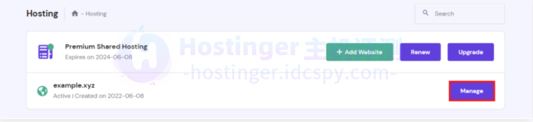 2、找到您的域名并点击管理。(在hPanel上管理托管菜单)