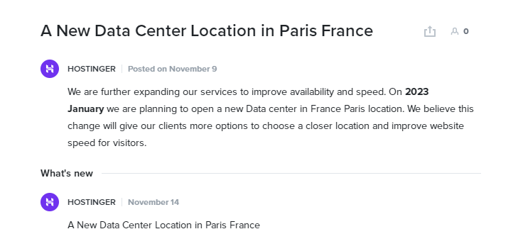 Hostinger目前有6个机房,然而Hostinger官方计划中,2023年1月将新增法国机房。具体的文件内容如下: