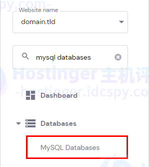 Hostinger主机可以从MySQL数据库页面完全管理您的MySQL数据库。要创建数据库,只需转到Hostinger→ Manage,在侧栏上搜索MySQL Databases并单击它: