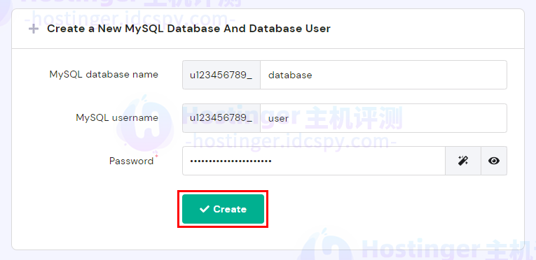 在“创建新的MySQL数据库和数据库用户”部分中,输入您的 MySQL 数据库名称、用户名和密码,然后单击“创建” :