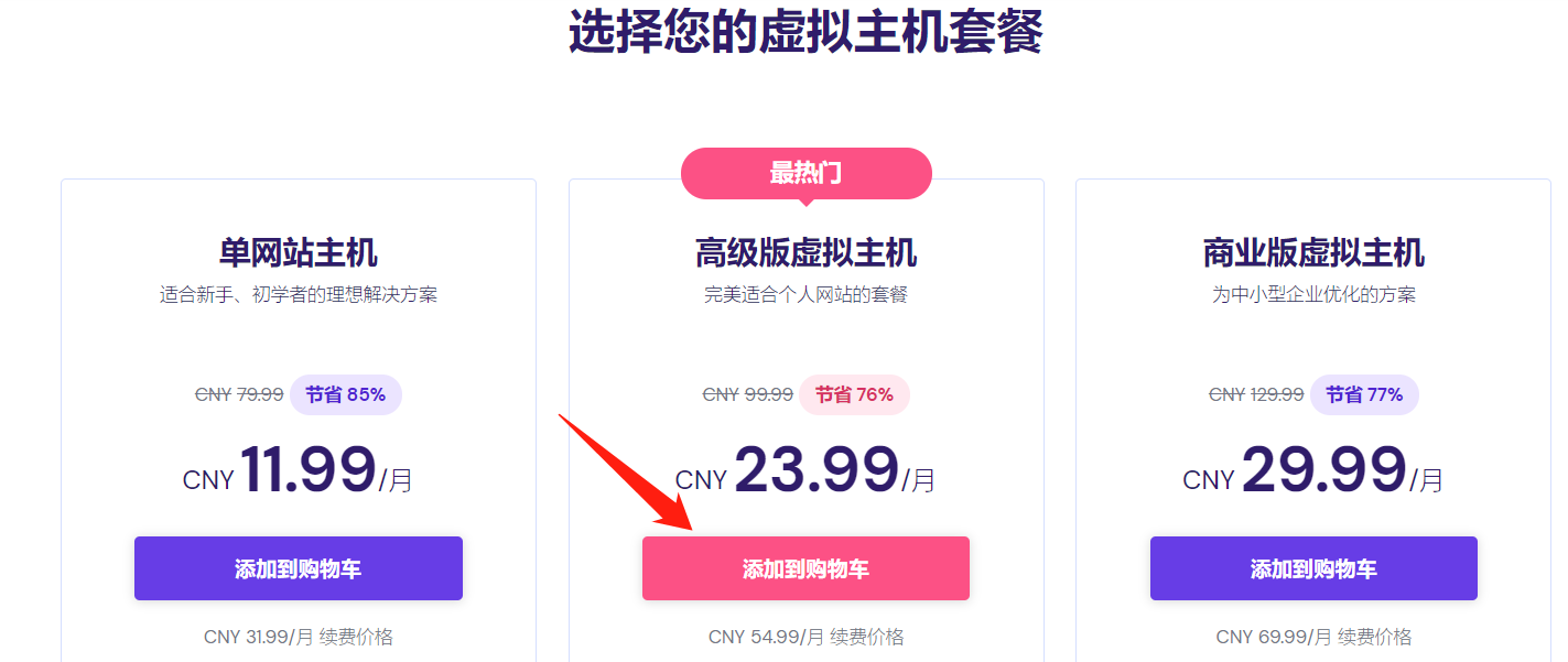 前往Hostinger官网,选择一款需要租用方案,在这里小编选择Hostinger虚拟主机高级版方案,点击添加。