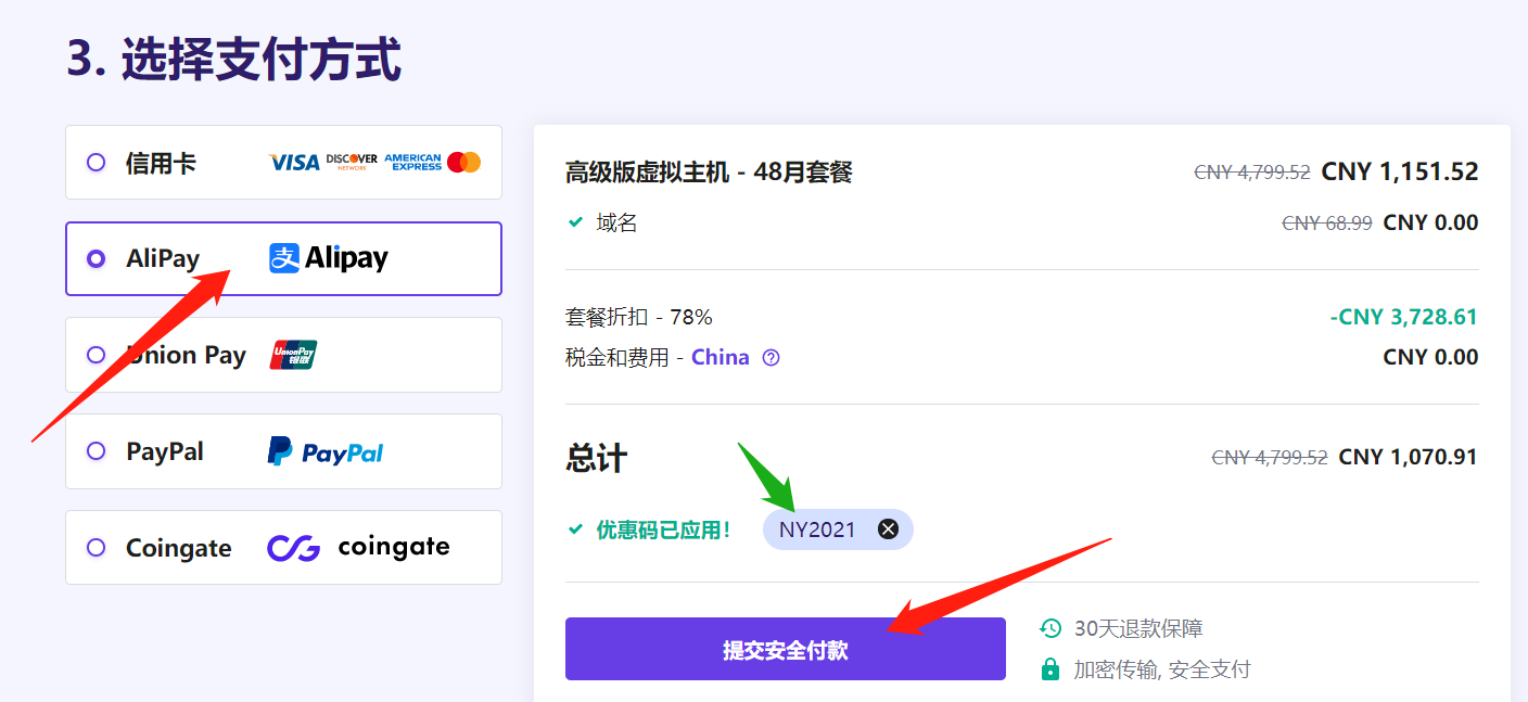 在这个页面可以看到Hostinger支持的所有支付方式都在上面,想用什么付款就选择什么,如下: