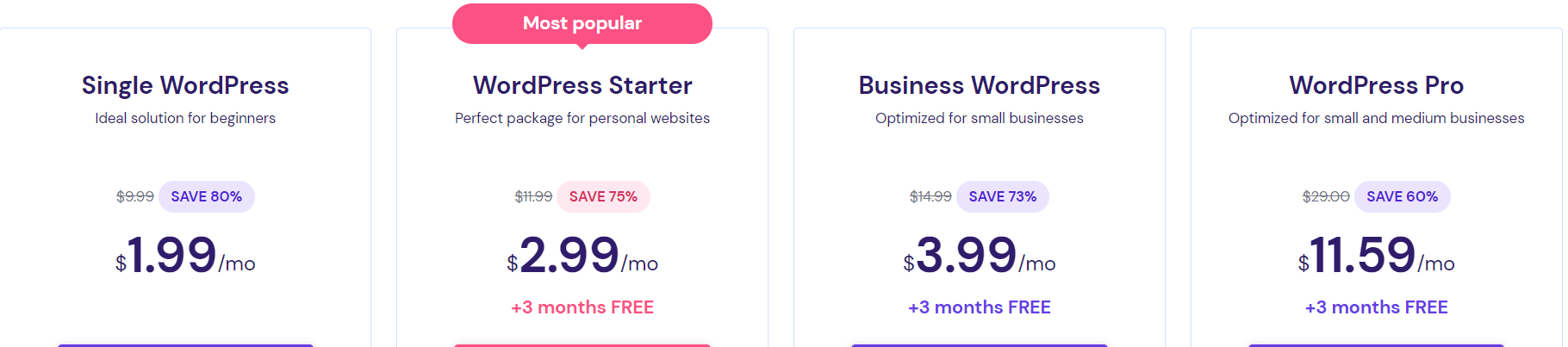 Hostinger WordPress主机有没有优惠?答案是有的,而且小编对比了Hostinger站点,英文站目前WordPress主机最优惠,四款方案,最低$1.99元起,每款方案满足不同的建站需求,具体方案详情如下介绍: