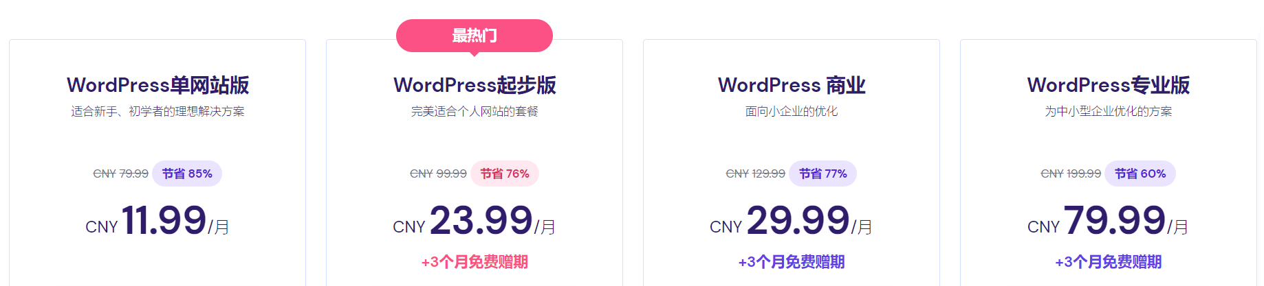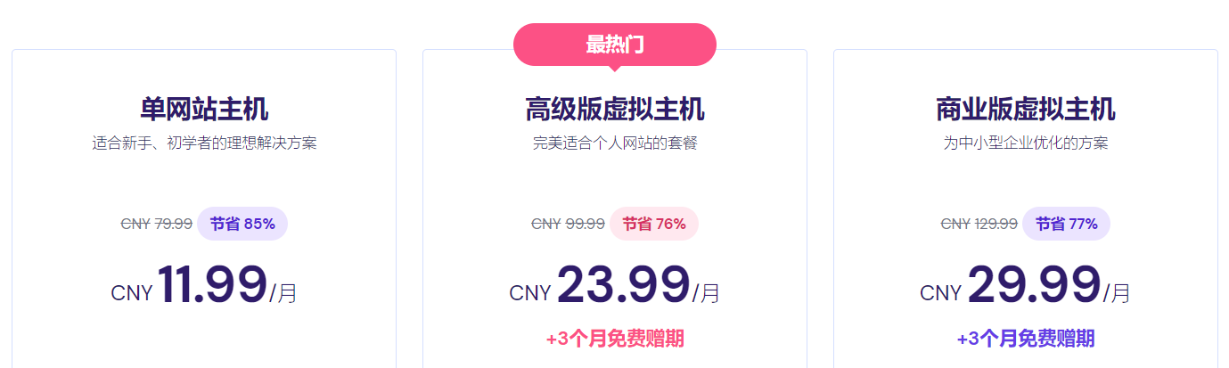 从上面的活动内容可以看到,不仅赠送免费3个月,每款主机折扣力度也不一样,虚拟主机最高折扣77%,云主机最高折扣60%,WordPress主机最高折扣85%,大家根据自己需求选择。