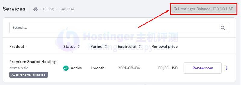 可以在页面右上角的账单→服务中找到Hostinger余额: