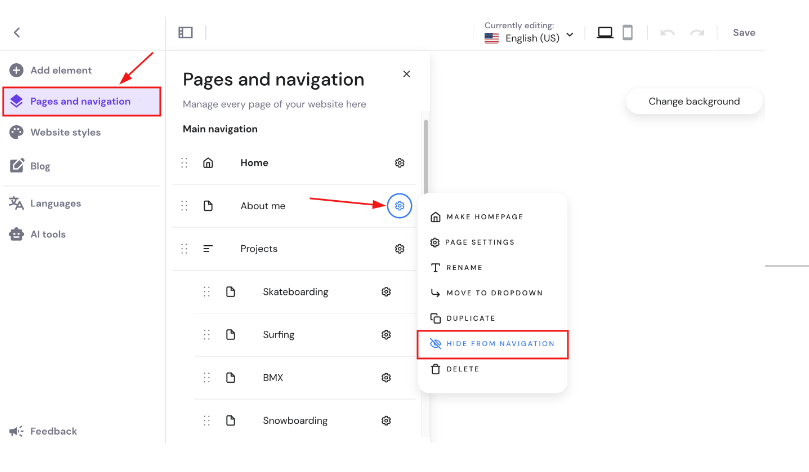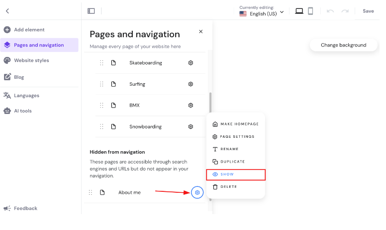 要取消隐藏页面,请打开其设置并选择显示。或者只需将页面向上拖动到主导航部分: