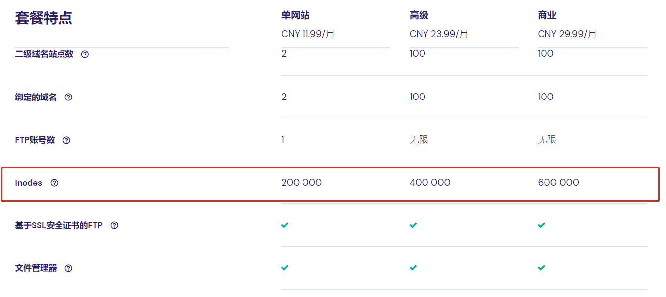 Inode是与Hostinger虚拟主机帐户中的文件和文件夹数相对应的项目,那么Hostinger虚拟主机方案是支持的,但是三款方案支持Inodes数量是不同的,分别是200000、400000、600000,接下来介绍具体的方案详情。