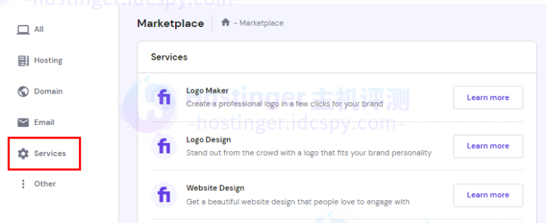 - hPanel侧边栏显示可用的Fiverr服务:徽标制作器和网站开发;