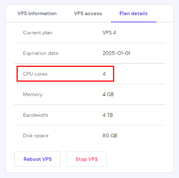 如果您有Hostinger虚拟主机或云主机计划并想知道CPU内核的数量,可以在面板的“详细信息”部分查看此信息: