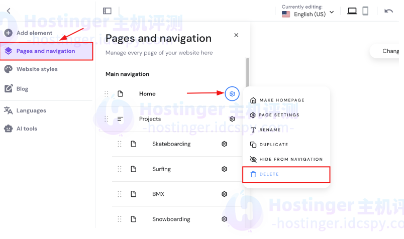 Hostinger建站:如何删除一个网站页面? 作者: hostinger 发布: 2023年06月30日 更新于: 2023年06月30日 1,773阅读 在Hostinger网站生成器中,展开左侧的页面和导航面板,找到要从网站中删除的页面。点击页面标题旁边的设置轮,选择删除: 再次单击“删除”确认页面删除。最后,更新你的网站,以反映在线的变化。 注意:要删除主页,请先将另一个页面设置为主页。 推荐:《如何将域名与Hostinger虚拟主机连接?》 本文来自网络,不代表Hostinger评测网立场,转载请注明出处:https://host.idcspy.com/1833.html 标签:Hostinger建站