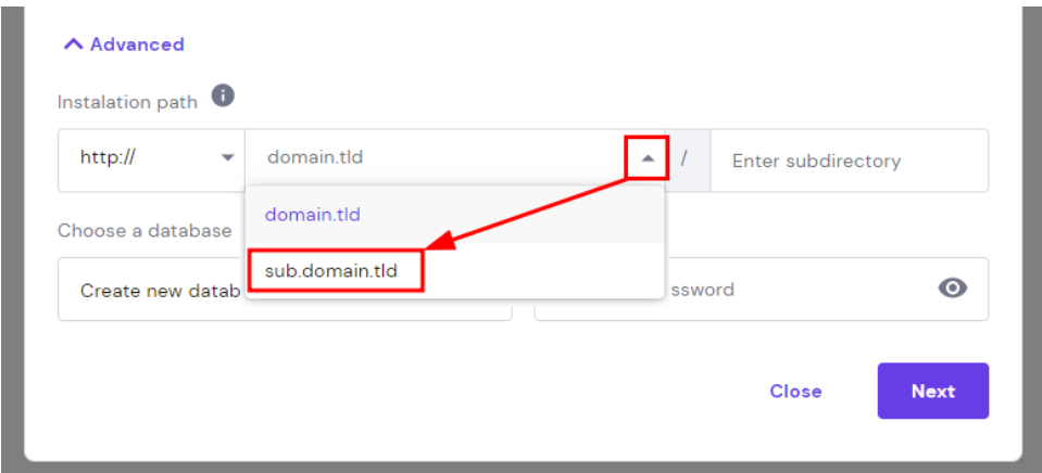 如果您想指定自定义子目录或使用现有数据库,请选择“高级”并填写信息: