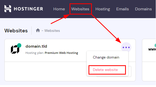 在hPanel→网站中,删除您创建的网站: