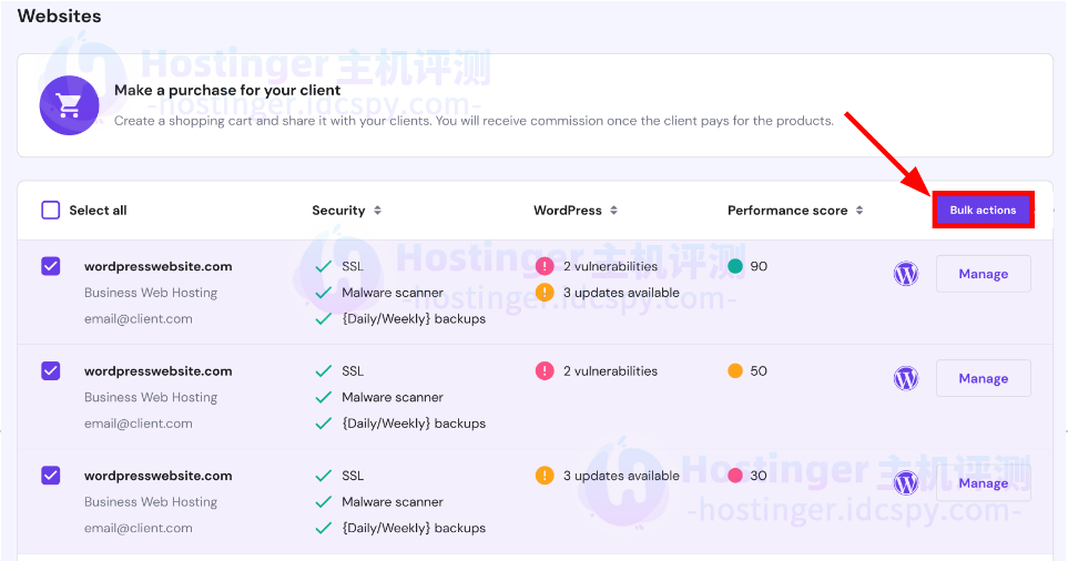 在Hostinger的专业面板中使用WordPress网站执行批量操作,对WordPress的核心版本、插件和主题进行批量更新,首先进入专业面板-官方网址,选择所有你想修改的WordPress网站,然后点击批量操作: