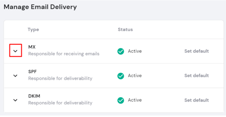 您始终可以通过导航到电子邮件→域名→电子邮件传递来查看您帐户的默认MX记录,只需单击MX附近的箭头: